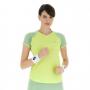 Women's slim-fit padel t-shirt. This line guarantees high levels of functionality for competitive players of any age and gender, since it includes graphic solutions and colours that are consistent between men and women and are coordinated with the chromatic proposals of the footwear. Particular attention is paid to the design of the products to ensure that they meet ergonomic parameters to facilitate rapid movements, free from constraints. The main features are obtained thanks to the use of specially developed fabrics and to the study of the cuts and the construction of the garments to meet the needs of the game. The products are largely made with the latest generation of recycled materials.